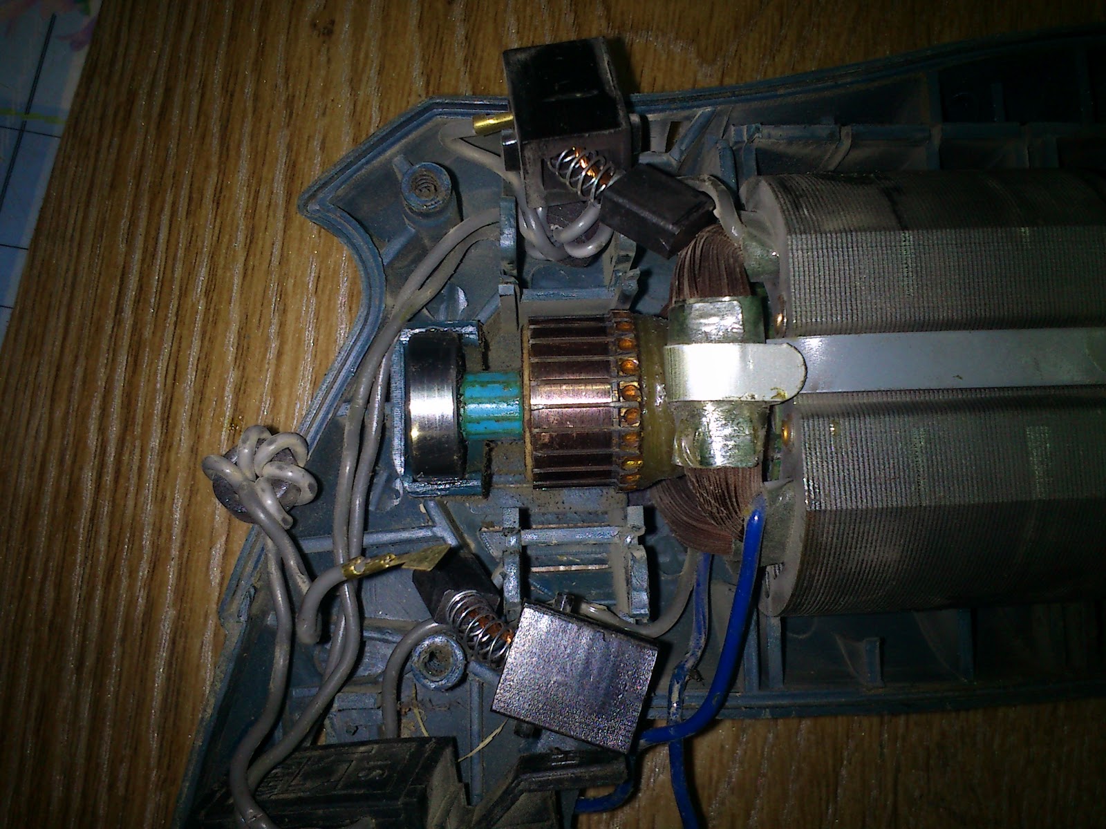 щеток электродвигателя. Щетки делаются из прочного графита и стираются от долгой эксплуатации, они могут быть виновны в неисправности электрической части изделия — при работе в нормальном режиме каждая из них искрит. Частые неполадки — пыж из пыли между телом щетки и ротором. - Коллектор. Если его контакты чистые, то вращение ротора плавное.